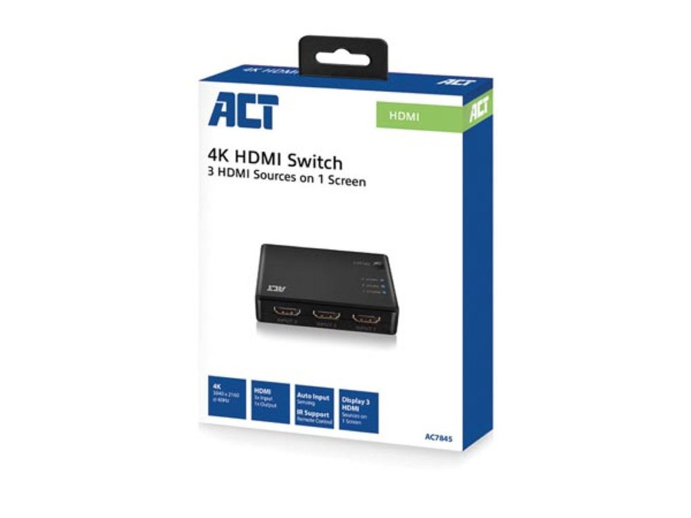 Lo switch HDMI 4K AC7845 3x1 rende facile visualizzare tre sorgenti HDMI come un laptop, una console di gioco o uno streamer TV su un solo monitor. Goditi il cambio delle sorgenti senza interruzioni con il telecomando incluso. Con la funzione di rilevamento automatico dell'ingresso, lo switch passa automaticamente alla sorgente disponibile per la massima comodità.