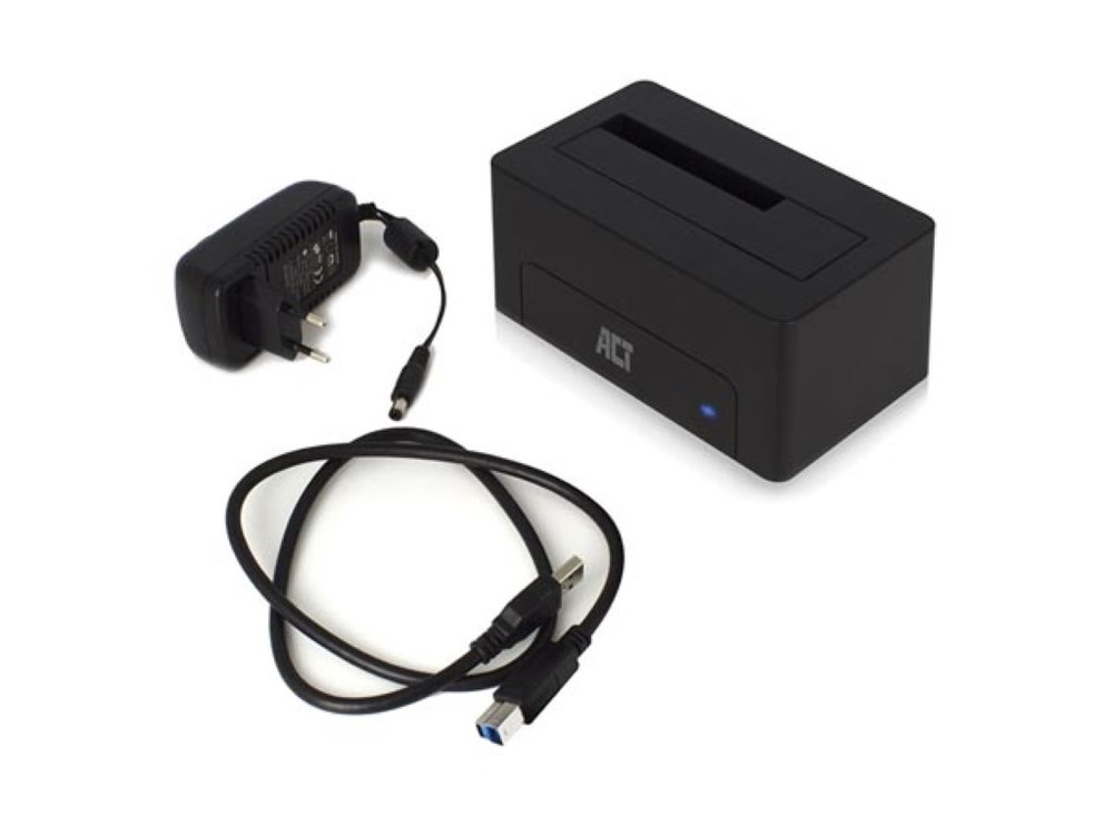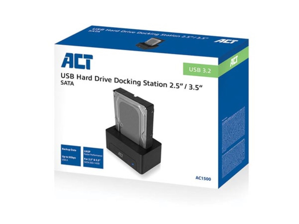 La docking station ACT AC1500 ti permette di collegare in modo semplice un hard disk SATA da 2.5 o 3.5 pollici alla porta USB del tuo computer, rendendo facili i trasferimenti di dati o i backup.