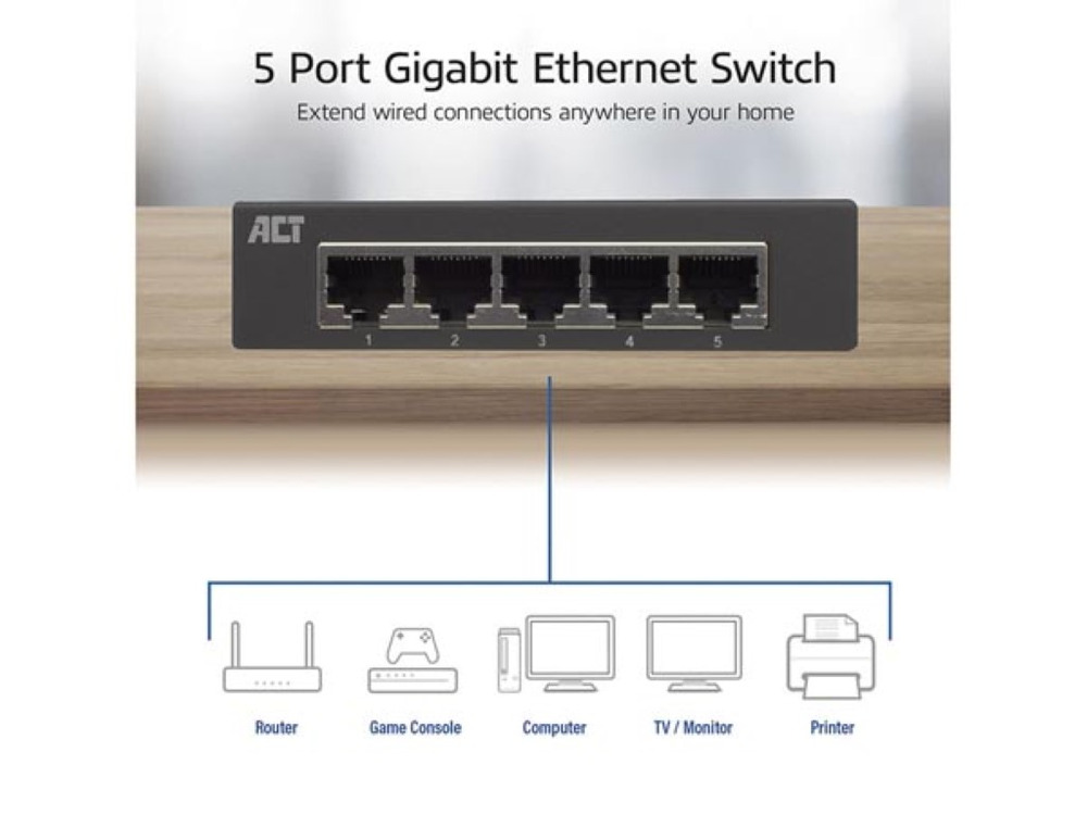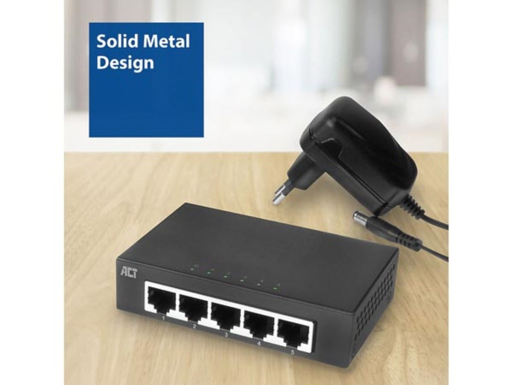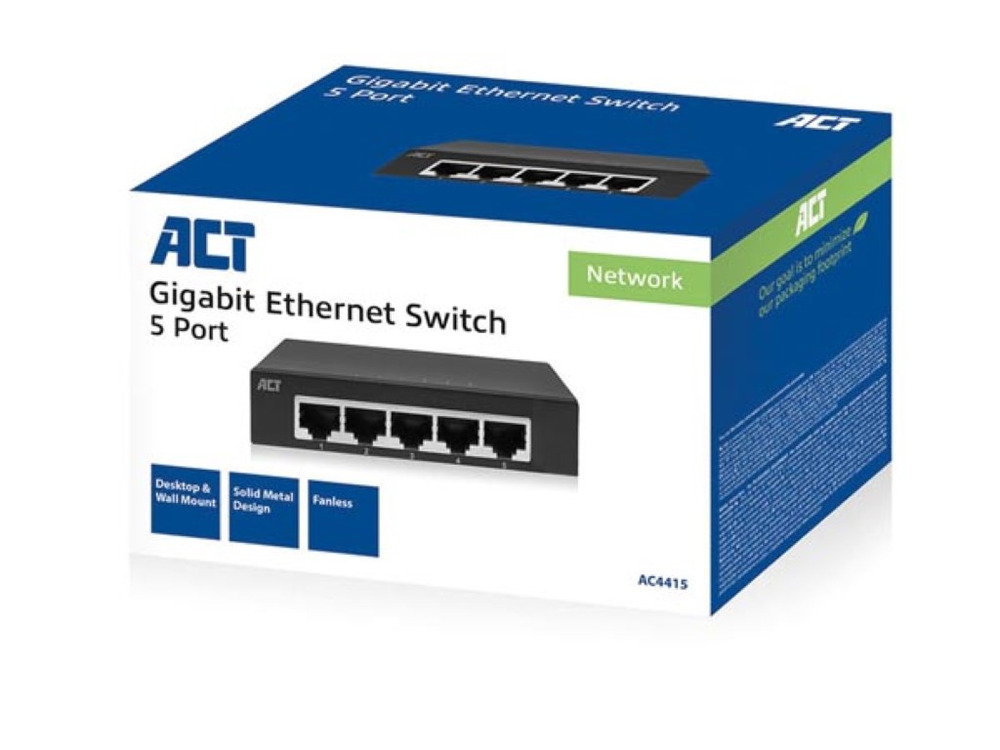 Het ACT AC4415 Switch Gigabit Ethernet a 5 Porte offre una gestione della rete semplice e veloce. Il design solido in metallo senza ventola garantisce un'efficiente dissipazione del calore senza produrre rumore. Questo switch supporta sia il montaggio su scrivania che a parete.
