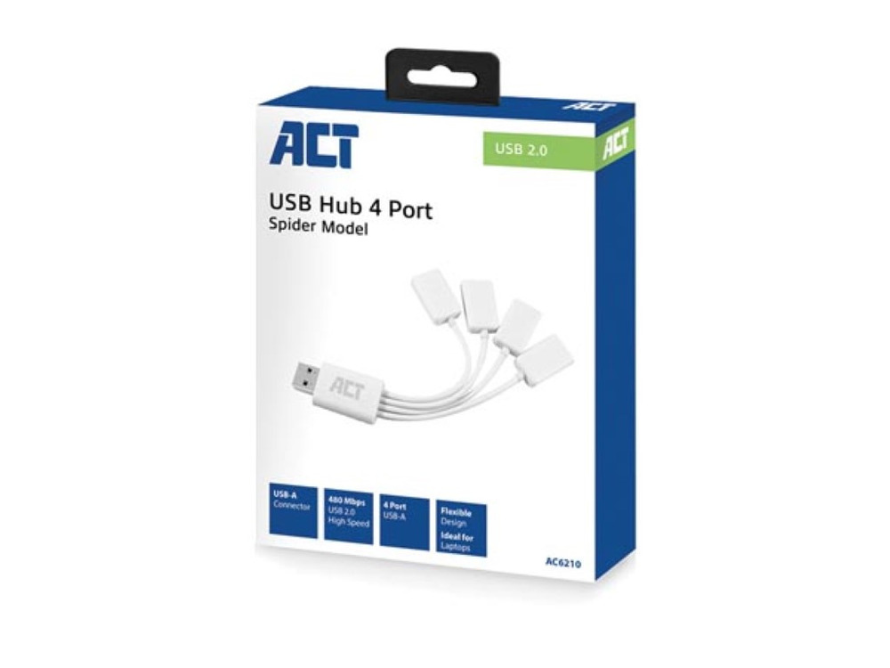 De ACT AC6210 Flexibele 4-poorts USB-hub breidt je pc of laptop eenvoudig uit met vier extra USB-aansluitingen.