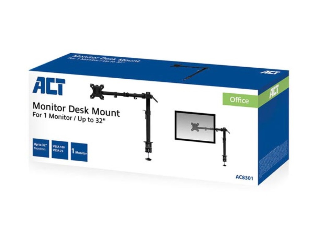 Con un sistema pratico per il montaggio del monitor. L'ACT AC8301 ha tre punti di rotazione per regolare la distanza di visione ideale. Il supporto da scrivania ACT è adatto per un monitor fino a 32 pollici con un peso massimo di 8 kg. L'AC8301 è dotato di attacchi VESA da 75x75 mm e 100x100 mm. Il semplice sistema di montaggio permette di fissare facilmente un monitor al supporto da scrivania. L'ACT AC8301 viene fornito con tutto il materiale di fissaggio per il montaggio sia a morsetto che a passacavo.