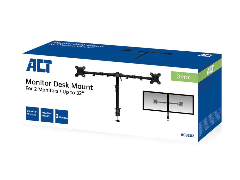 De ACT AC8302 è progettato con tre punti di snodo per monitor ciascuno e supporta schermi fino a 32 pollici con un peso massimo di 8 kg ciascuno. Compatibile con attacchi VESA di 75x75 mm e 100x100 mm. Include tutti gli strumenti di montaggio per il fissaggio a morsetto o passante, così puoi migliorare facilmente la tua postazione di lavoro senza bisogno di aiuto extra.