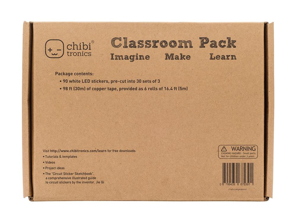 Il Pacchetto Aula Circuit Sticker di Chibitronics (LED bianchi) permette a fino a 30 studenti di esplorare il mondo entusiasmante dei circuiti di carta. Ogni pacchetto include 90 adesivi a LED bianchi e 98 piedi di nastro di stoffa conduttivo, offrendo risorse abbondanti per diversi progetti.