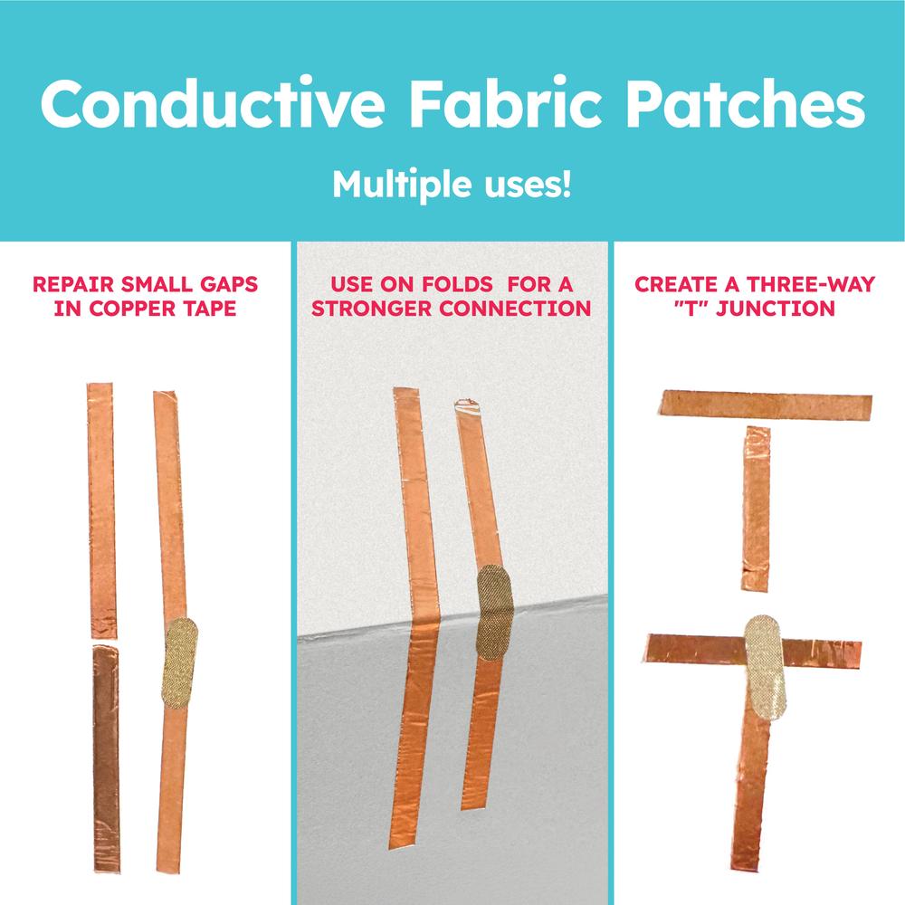 Ogni toppa di nastro in tessuto conduttivo include un adesivo altamente conduttivo su un lato, permettendo un utilizzo versatile in progetti elettronici. Ripara senza problemi le interruzioni nel nastro di rame, crea giunzioni a T, o collegati ai prodotti Love to Code con precisione semi-permanente. Estendi la funzionalità dei LED Circuit Sticker con facilità.