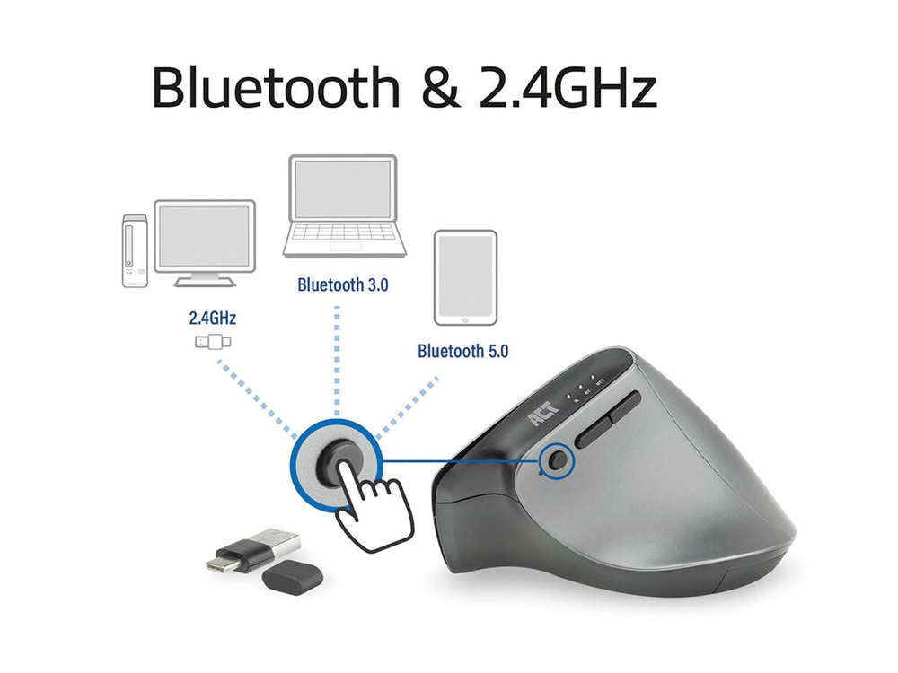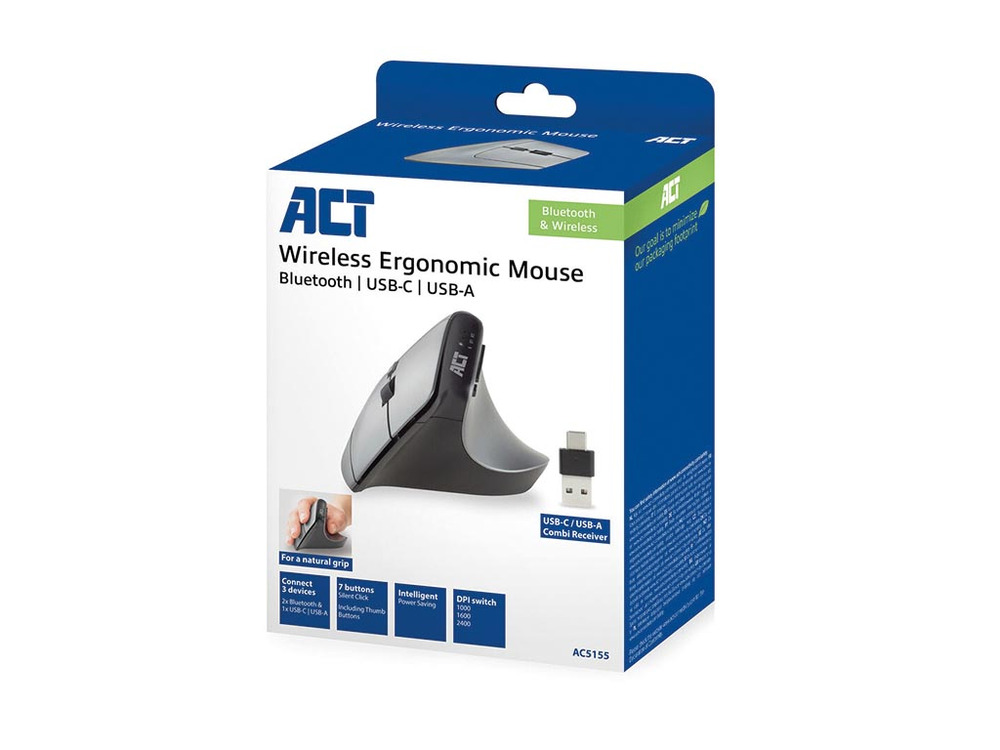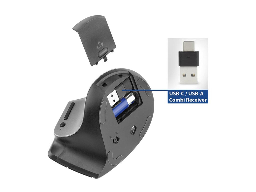 La mouse ergonomica wireless con Bluetooth e USB-C/USB-A offre una connettività senza interruzioni e un design ergonomico. Puoi passare facilmente tra tre dispositivi tramite due connessioni Bluetooth e un ricevitore USB-C/USB-A. Questo ricevitore compatto può essere riposto in sicurezza all'interno del mouse.