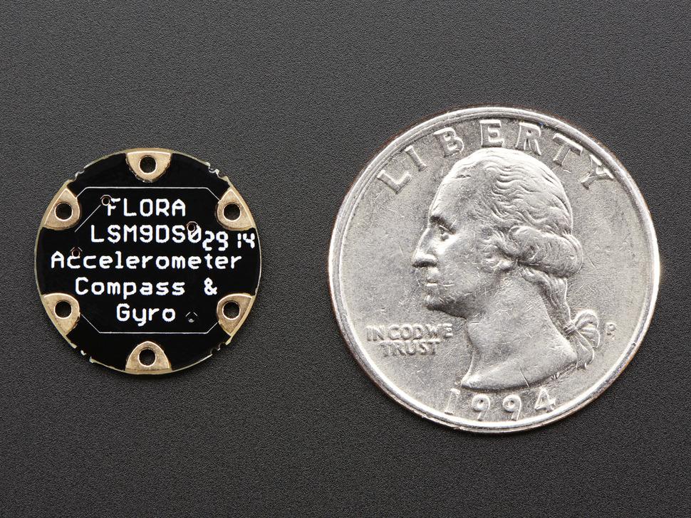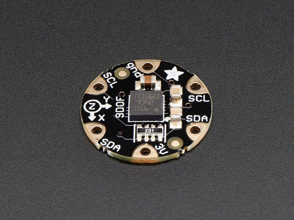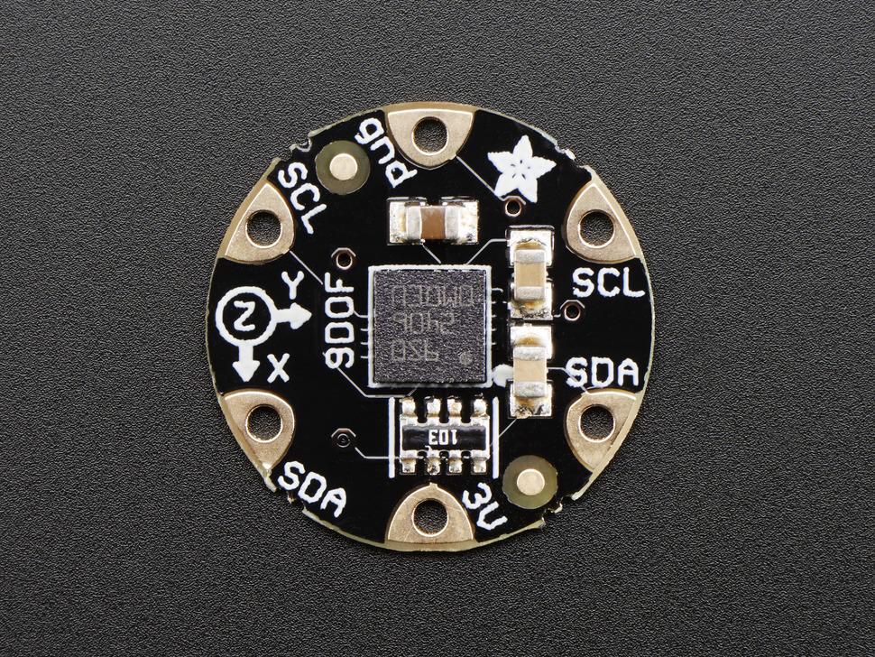 Aggiungi rilevamento di movimento, direzione e orientamento al tuo progetto FLORA indossabile con questo modulo sensore ad alta precisione a 9 gradi di libertà. Al suo interno sono presenti tre sensori distinti: un classico accelerometro a 3 assi misura gravità e accelerazione, un magnetometro a 3 assi rileva il nord magnetico e un giroscopio a 3 assi cattura rotazione e torsione. Insieme, questi sensori forniscono dati di orientamento completi.