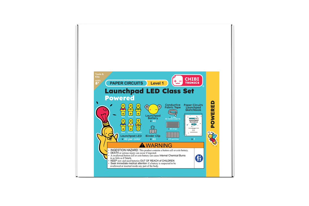 Consigliato per bambini dagli 8 anni in su, questo set per la classe è progettato per 40 studenti con l'alimentazione inclusa. I LED e le batterie del Launchpad sono robusti, facili da monitorare e hanno grandi pad con polarità + e - ben visibili, permettendo di riposizionarli e riutilizzarli facilmente. Ideale per il corso di Circuiti di Carta Livello 1.