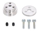 Questo gruppo in alluminio in due parti si monta direttamente su alberi di uscita del motore da 4 mm di diametro come quelli dei nostri motoriduttori da 25D mm e consente di guidare la maggior parte di scooter, skateboard, pattini in linea e altre ruote comuni compatibili con i popolari cuscinetti a sfera 608. Sono incluse due viti M4 per fissare l'adattatore filettato all'albero motore e tre viti M3 da 14 mm per bloccare la ruota tra l'adattatore filettato e la rondella.