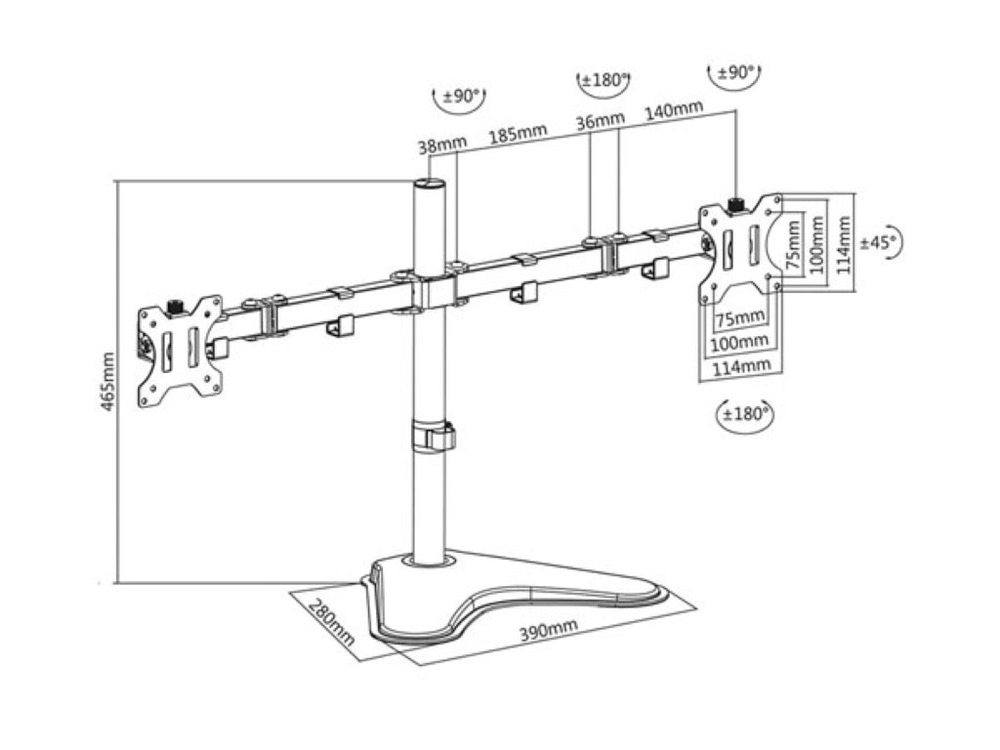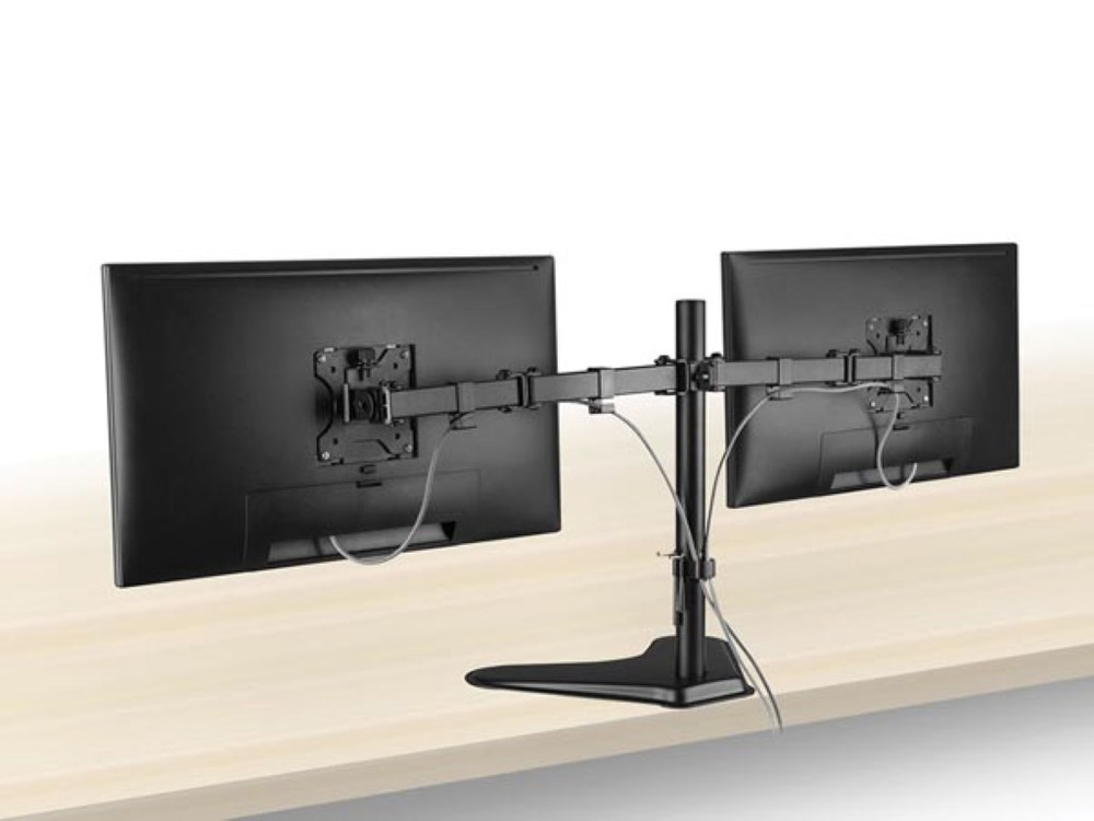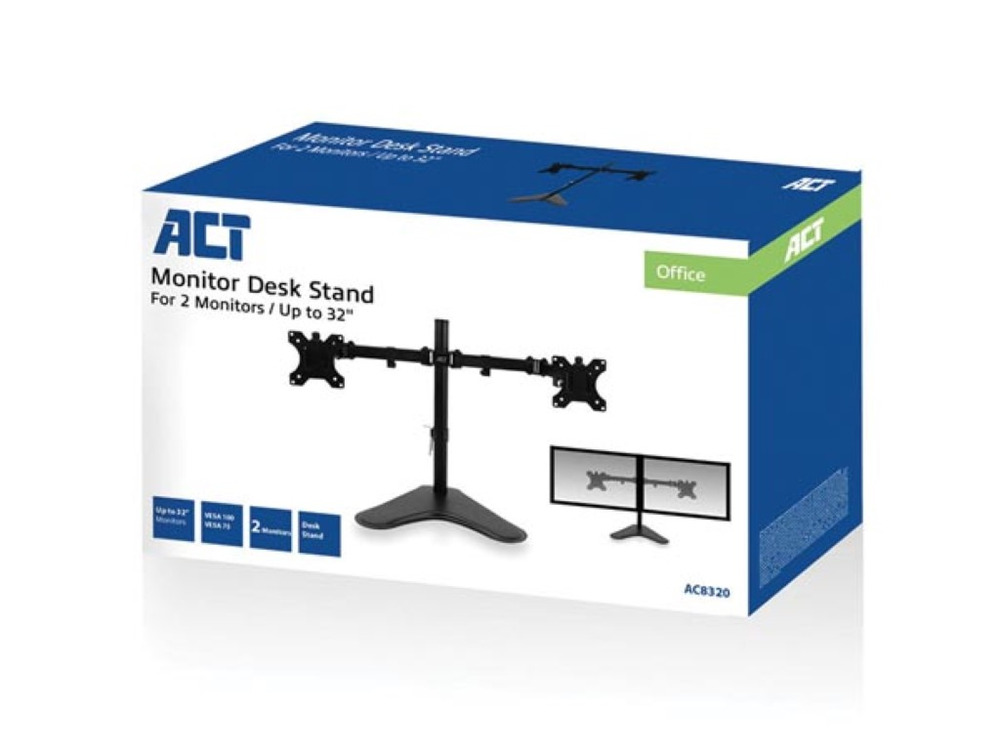Migliora facilmente il tuo spazio di lavoro con questo supporto universale per due monitor. Progettato per sostenere due schermi fino a 32 pollici e 8 kg ciascuno, offre una soluzione robusta e affidabile per le tue esigenze di visualizzazione.