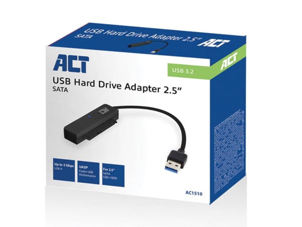Cavo adattatore USB 3.2 Gen1 (USB 3.0) per SATA da 2.5" per SSD/HDD. Il modo più semplice per aggiornare l'hard disk interno del tuo laptop è aggiungere un SSD o HDD esterno. Collega un hard disk SATA da 2.5 pollici o un'unità a stato solido al tuo laptop con il cavo adattatore AC1510 USB 3.2 Gen1 per SATA. Non è mai stato così facile cambiare hard disk. Inoltre, non devi montare prima l'hard disk in un case.Il cavo adattatore AC1510 USB 3.2 Gen1 per SATA supporta il protocollo UASP (USB Attached SCSI Protocol), che assicura un'alta velocità di trasferimento dati. Il cavo adattatore è alimentato tramite USB, quindi non è necessario un alimentatore esterno. L'AC1510 è ideale per la migrazione dei dati, la clonazione dei dischi e le applicazioni di backup dei dati.Il cavo adattatore AC1510 USB 3.2 Gen1 per SATA è compatibile all'indietro con USB 3.0, USB 2.0 e USB 1.1.